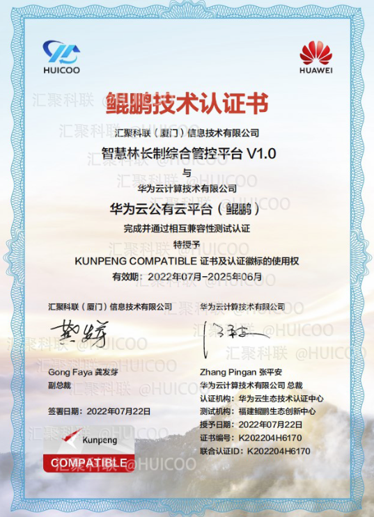 匯聚科聯(lián)自主研發(fā)的“智慧林長制綜合管控平臺1.0”與華為云計(jì)算技術(shù)有限公司的華為云公有云平臺(鯤鵬)完成并通過相互兼容性測試認(rèn)證,正式獲得華為鯤鵬技術(shù)認(rèn)證書